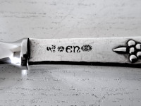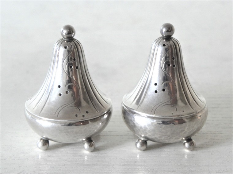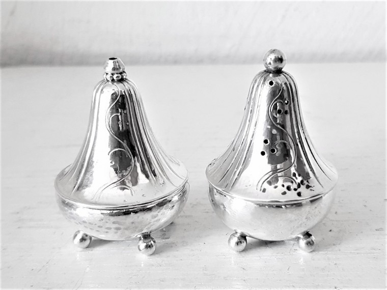 2 st, par, halvklotformad underdel p tre kulfötter, toppig överdel m ciselerade slingor o ströhål, des Harald Nielsen, H4,8 vikt 40g TOPPSKICK