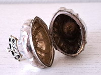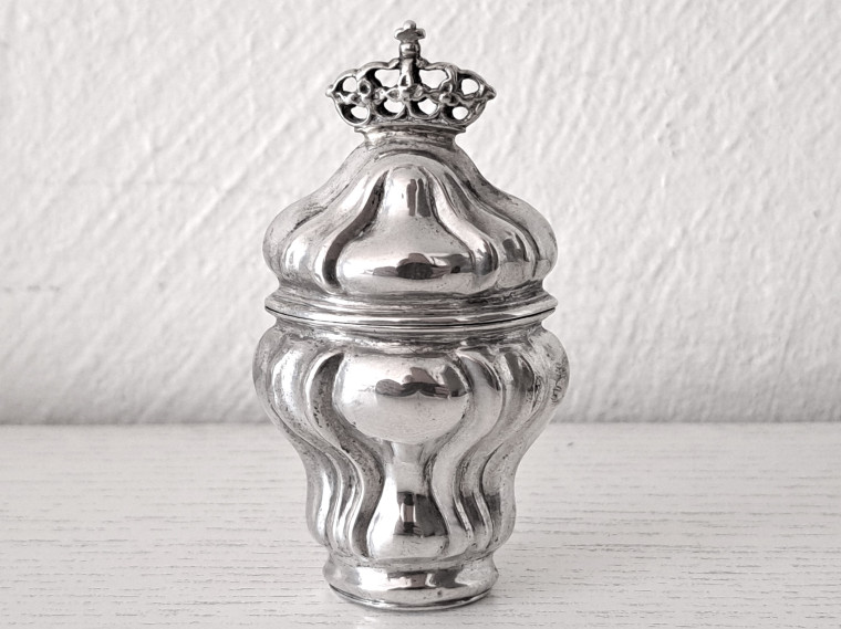 Mkt vacker, bukigt liv m ovalt tvärsnitt o reliefåsar, lockknopp m krona, inv förgylld, H7 vikt 24g TOPPSKICK, TILLFÄLLE