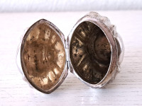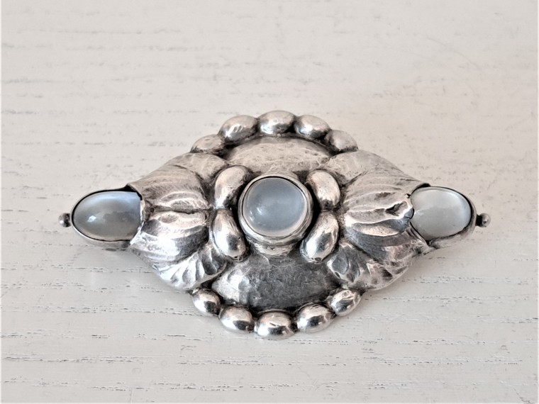 Utsökt vacker, oval form m växtdekor i hög relief i utpräglad jugend, tre infattade Månstenar, 5,8 H3,2 vikt 14g MKT HÖG KVALITÉ, TOPPSKICK