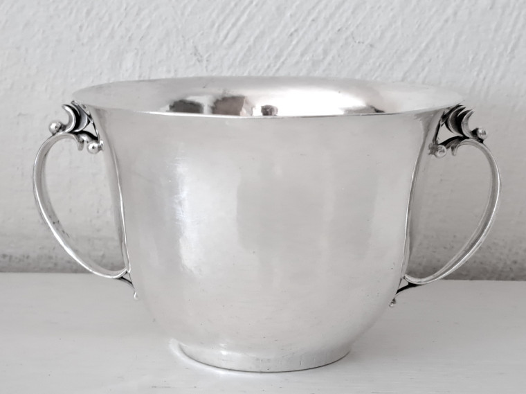 Mkt vacker Skål m två uppsvängda hänklar p plan botten, vackert hamrad yta, modellnr 456A, L15 D11,5 H8 vikt 200g TOPPSKICK