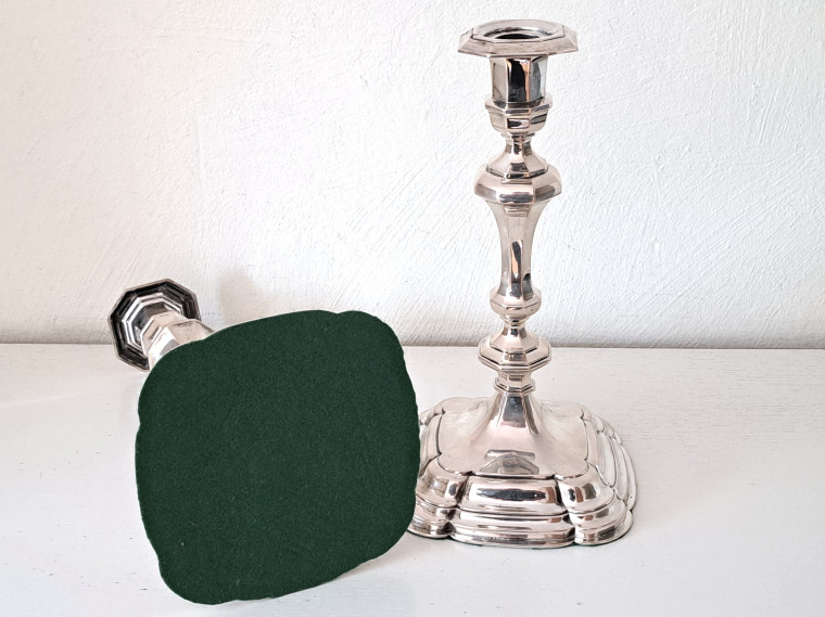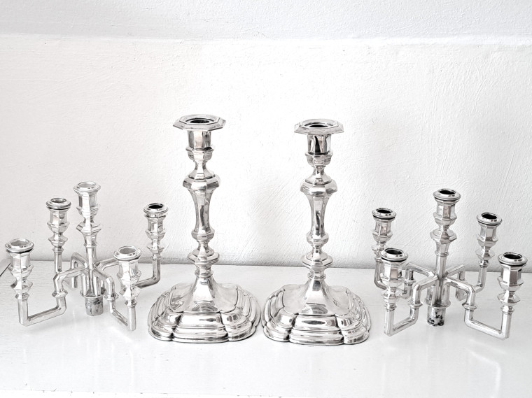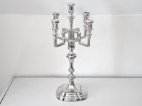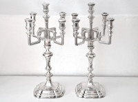 Mkt exklusiva i senbarockstil p mjukt kvadratisk trappstegsformad fot, hög stam m noder, fyra vinklade armar samt central ljuspipa för fem ljus, H44.5 D24 tot vikt 3,75 kg inkl fyllda fötter TOPPSKICK, TILLFÄLLE