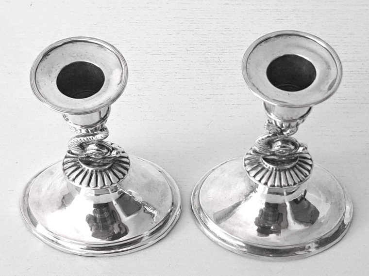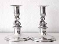 Ett par underbart vackra Ljusstakar p oval välvd slät fot, cylindriska ljuspipor uppburna av DELFINER, toppskick, ngt otydl mästarstpl H12,3 vikt 340g inkl fyllda fötter MKT DEKORATIVA, TOPPSKICK
