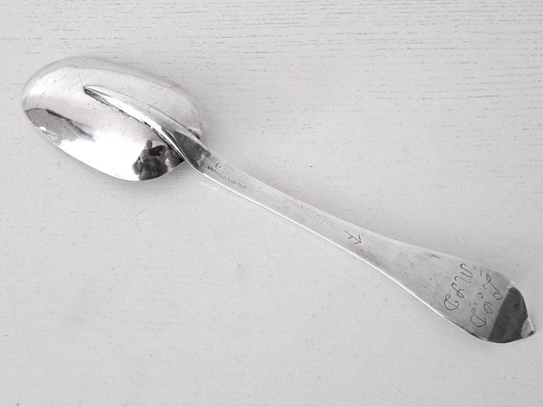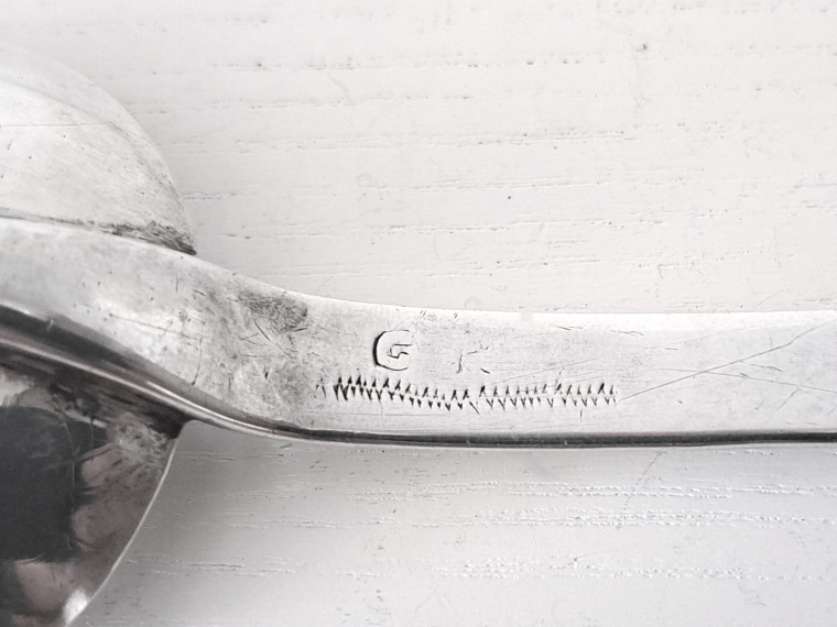 Högklassig, mkt gedigen, c:a 1700, svagt slagna men helt entydiga stämplar, åldermansranka, L22,2 vikt 71g TOPPSKICK