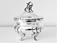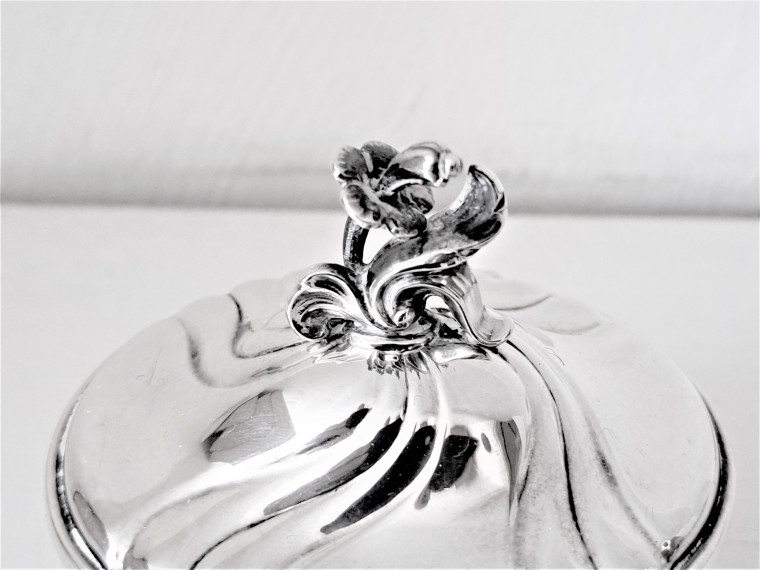 Högklassigt, utsökt vackert, bukigt p fyra fötter, välvt lock m blomknopp, liv o lock m svängda reliefåsar, inv förg, L9 H11 vikt 170g TOPPSKICK