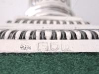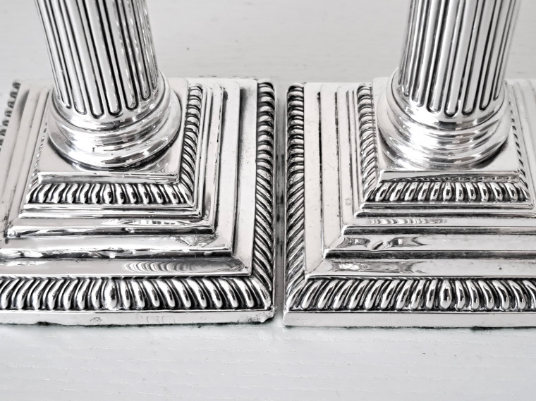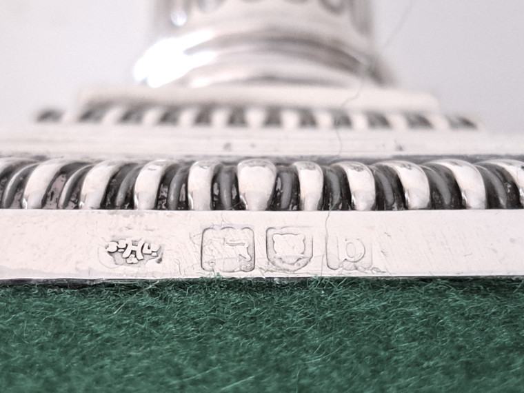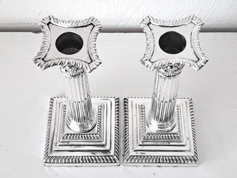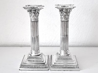 Synnerligen eleganta p kvadratisk trappstegsformad fot m godronnering, cylindrisk kannellerad stam m korintiskt kapitäl, några mindre intryckningar i foten, H18 tot vikt 820g inkl fyllning HÖG KVALITE