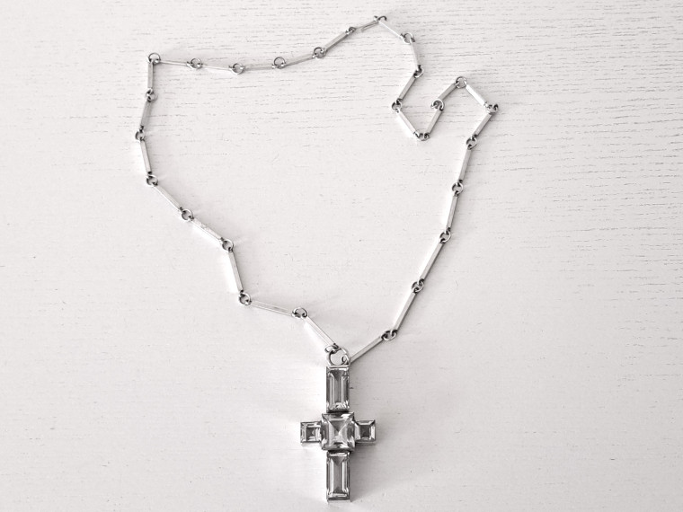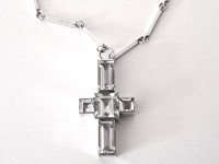 Mkt ovanligt, korset(5,4x3,1 cm plus ögla) best av fem infattade bergkristaller i perfekt skick, kedjans längd 60 cm TOPPSKICK
