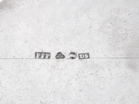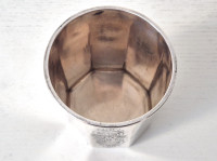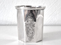 Utsökt vacker, åttkantigt rakt liv m cirkulär mynning p plan botten, varannat fält m sällsynt elegant nyrokokogravyr, H8 vikt 110g TOPPSKICK