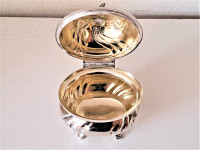 Högklassigt, utsökt vackert, bukigt p fyra fötter, välvt lock m blomknopp, liv o lock m svängda reliefåsar, inv förg, L9 H11 vikt 170g TOPPSKICK
