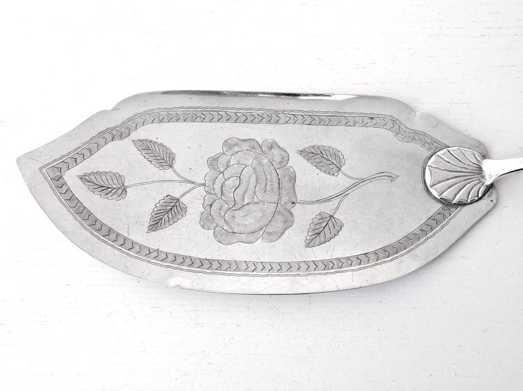Mkt elegant, stort blad m mkt vackert grav rosenkvist, slätt skaft m avslutande snäcka i relief, L31,4 vikt 105g TOPPSKICK