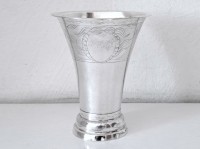 Högklassig, gedigen, vidgande p välvd fot, livets överdel m vacker grav blom- o bladdek, inv förgylld, minimal bristn i mynningskanten, H13,5 vikt 180g TOPPOBJEKT
